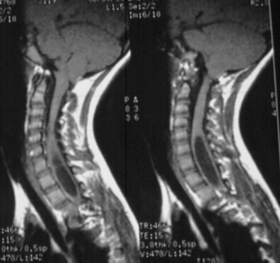 - 40-75% have associated syringomyelia, resulting in spinal cord symptoms