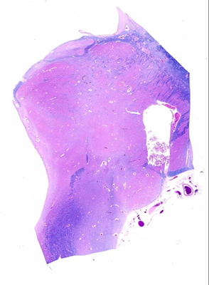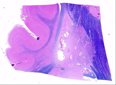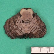 - chronic phase - firm, white, gliotic with tiny cystic cavities, widening of 3rd ventricle
