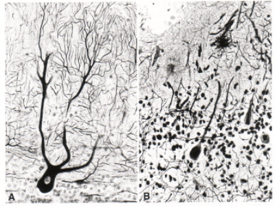 - Cerebral and cerebellar cortex preferentially affected, especially vermian folia