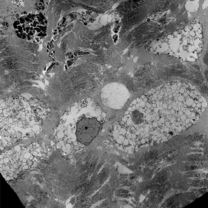 Lysosomal vacuoles and zebra bodies in mucopolysaccharidosis (mitral valve)