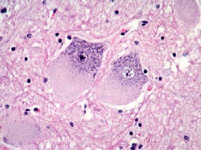- neuronal storage especially in the subcortical grey matter, including the spinal cord